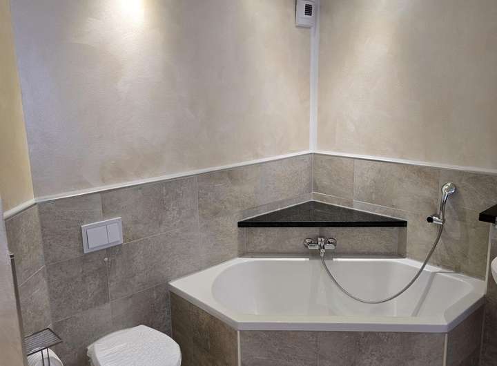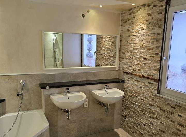 Durch die Treppe gelangen Sie in die 1. Etage. Zur linken Seite ist das Elternschlafzimmer nebst Ankleideraum. Geradeaus finden Sie eine Abstellkammer. Zur rechten Seite kommen Sie in das geschmackvoll und mediterran eingerichtete Bad mit Eckbadewanne, Regendusche, WC und 2 Waschbecken. Auch eine Handtuchheizung ist hier zu finden, sowie den angrenzenden separaten Hauswirtschaftsraum wo Waschmaschine und Trockner bei uns ihren Platz gefunden haben.