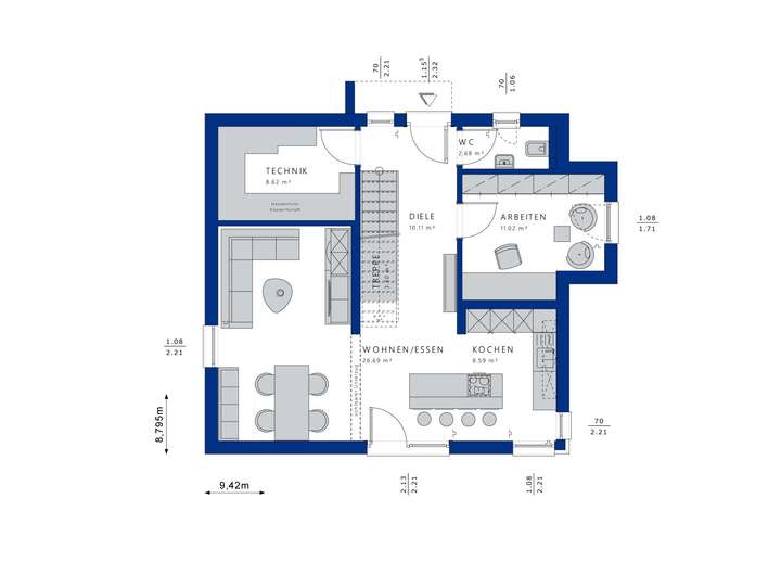 Willkommen in Ihrem zukünftigen Zuhause in Benningen am Neckar, ein modernes Fertighaus, das nach Ihren persönlichen Wünschen und Vorstellungen projektiert wird. Das EDITION 134 überzeugt durch sein durchdachtes Architekturkonzept und bietet Ihnen mit 135 m² Wohnfläche und vier Zimmern viel Raum für Familie und Freunde. Der Eingangsbereich ist flexibel gestaltbar - wählen Sie, ob die Treppe auf der Trauf- oder Giebelseite angeordnet ist. Im Erdgeschoss trennt ein klar strukturiertes Grundrisskonzept die großzügige Küche vom einladenden Ess- und Wohnbereich, während ein zusätzliches Arbeitszimmer, ein Gäste-WC und der Technikraum praktische Mehrwerte schaffen.