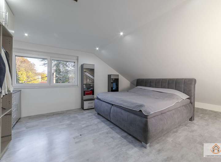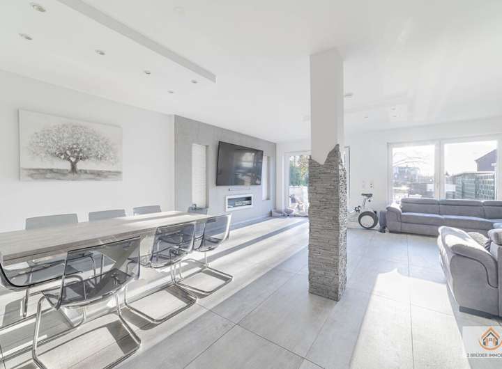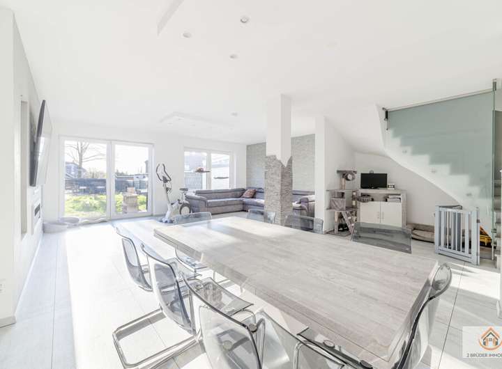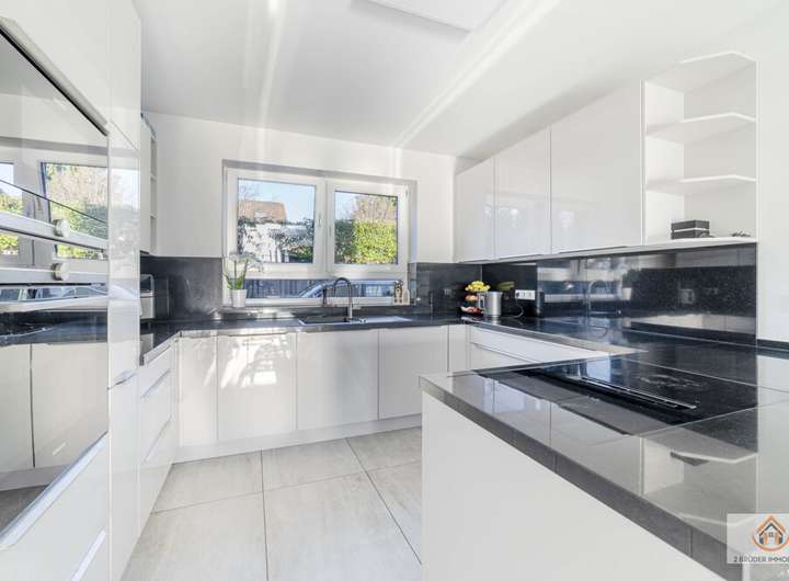 Der Wohnbereich ist großzügig gestaltet und lichtdurchflutet. Die hochwertige Einbauküche aus dem Jahr 2020 kann auf Wunsch übernommen werden. Sie ist mit Markengeräten ausgestattet und verfügt über eine massive Granitarbeitsplatte. Der Wert liegt bei rund 20.000 €. Die Küche ist nicht im Kaufpreis enthalten.
