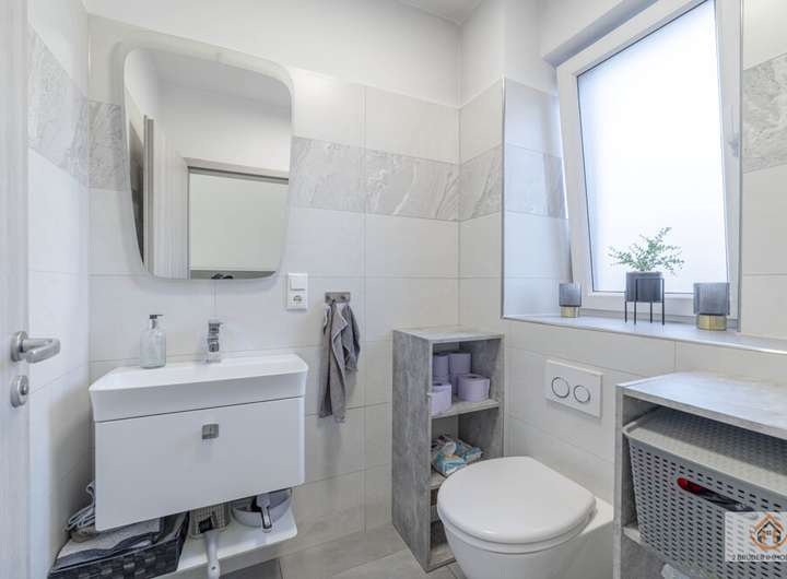 Ein modernes Badezimmer mit Wanne und Dusche sowie ein separates Gäste-WC stehen zur Verfügung. Wände und Decken sind glatt verputzt, die Wohnräume mit pflegeleichten Vinylböden ausgestattet. Ein großer Abstellraum sowie ein separater Hauswirtschaftsraum ergänzen das Raumangebot sinnvoll.