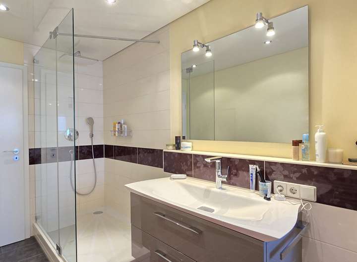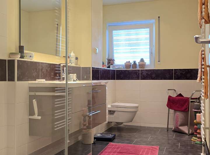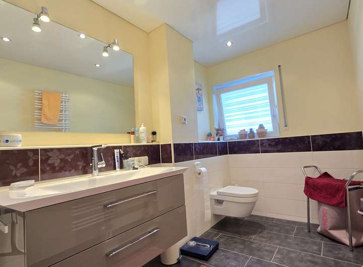 Badezimmer OG: Modernisiert, mit Fußbodenheizung, großer ebenerdiger Dusche, Spanndecke & LED-Spots