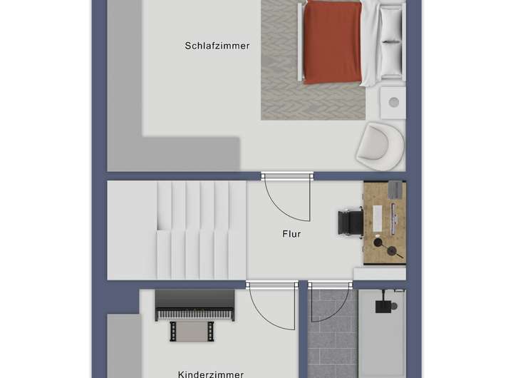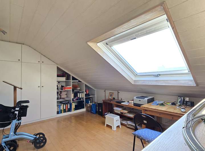 Im Erdgeschoss befindet sich das Wohnzimmer, im Obergeschoss das Schlafzimmer sowie ein Kinderzimmer, und im Dachgeschoss ein weiteres großzügiges Zimmer.