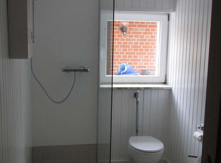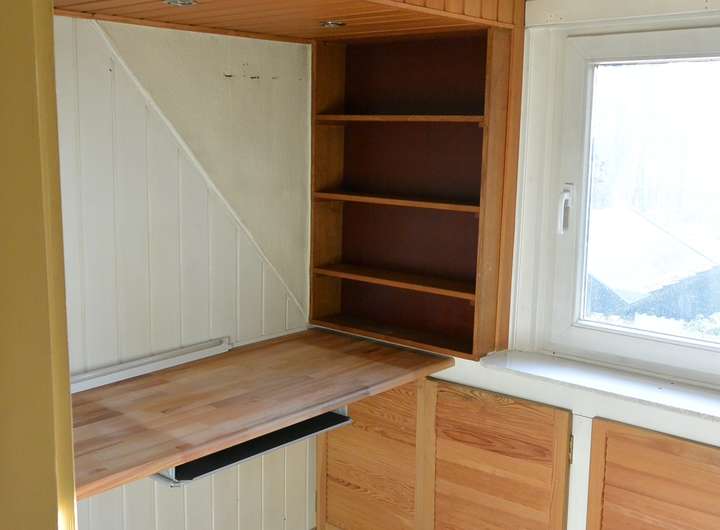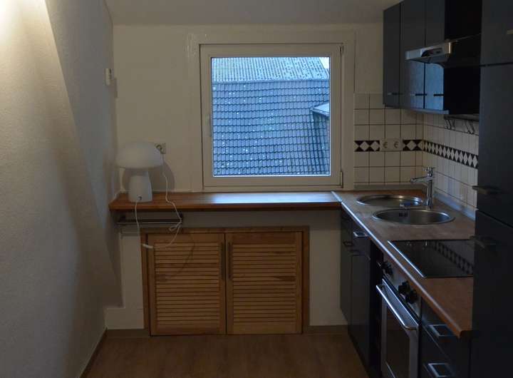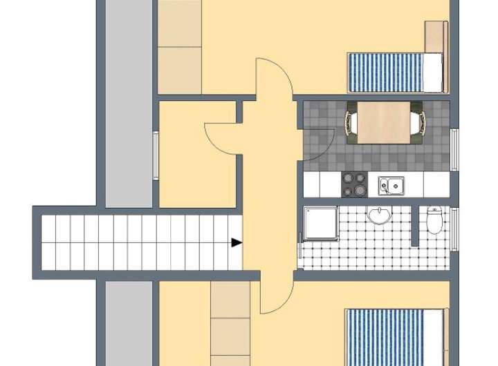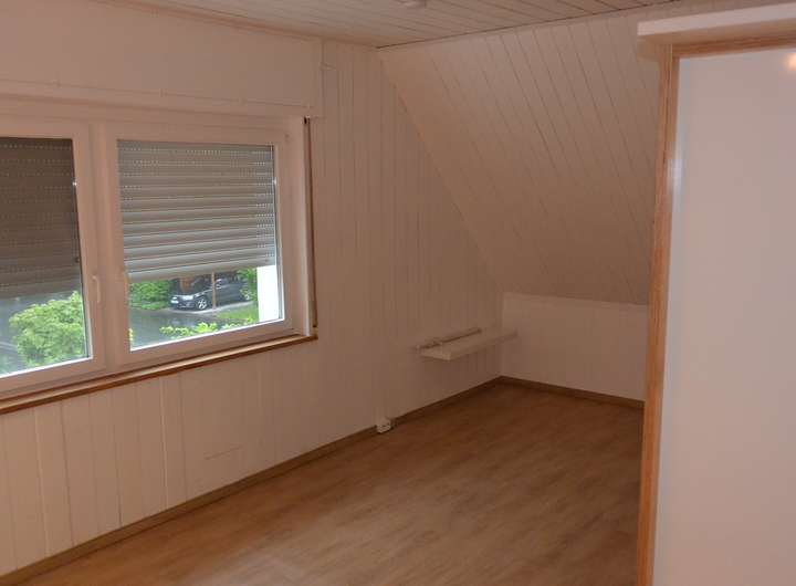 Wohnbereich im OG mit modernem Duschbad, Küche mit Einbauküche sowie 2 Schlafzimmern und einem kleinen Büro.