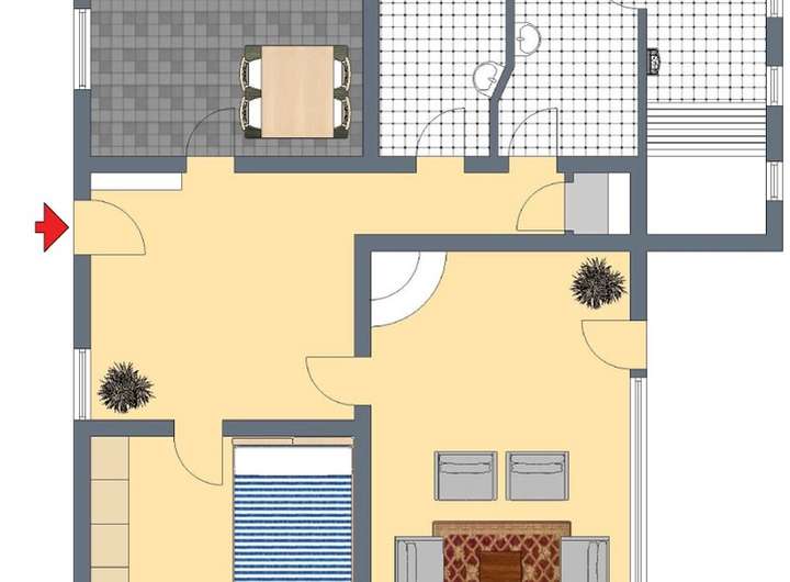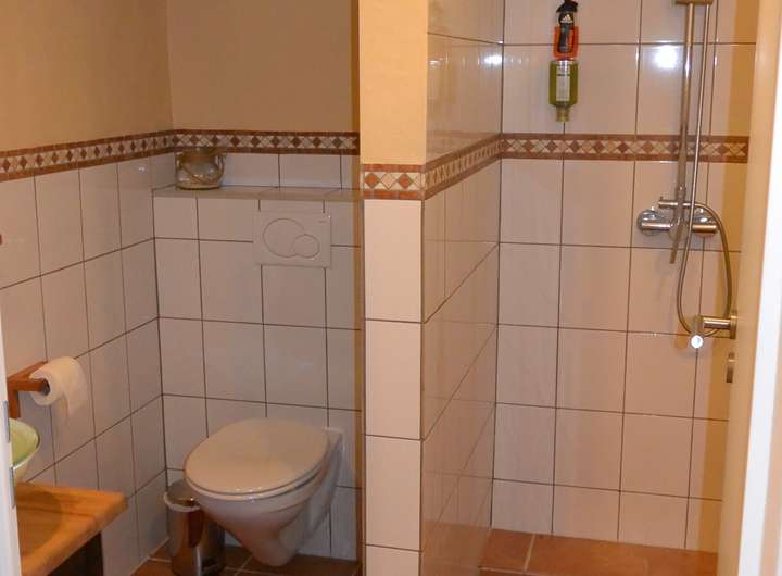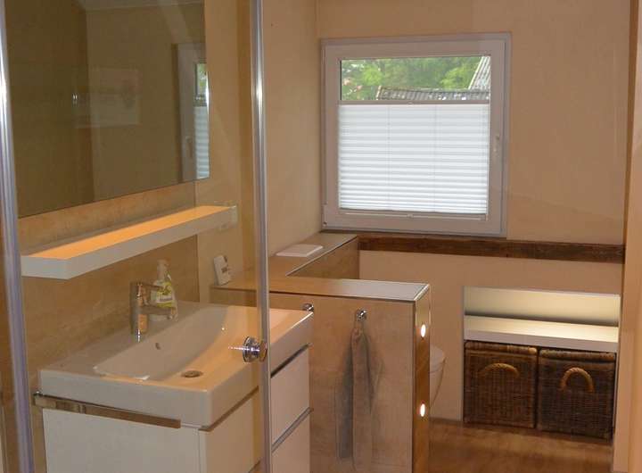Wohnbereich im EG mit Küche (alternativ als Schlafzimmer), Wohnzimmer, Duschbad und Schlafzimmer, Diele, großer Terrasse.