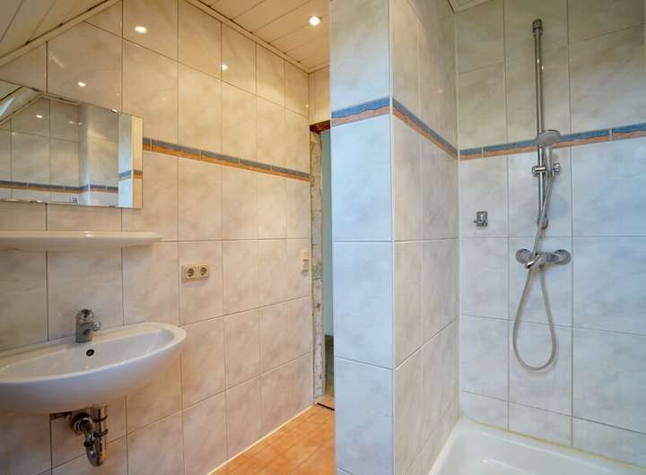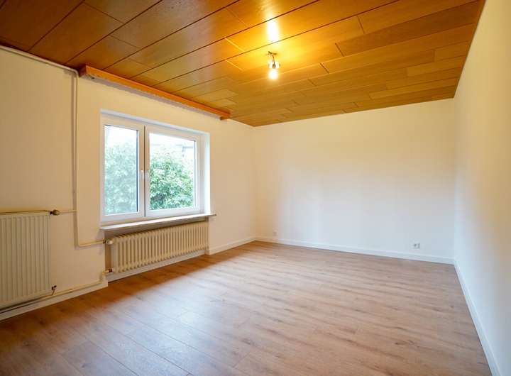 Im Erdgeschoss befinden sich ein Wohn- und Esszimmer, die durch Schiebetüren miteinander verbunden sind und sich bei Bedarf leicht voneinander trennen lassen. Die Einbauküche ist vollständig ausgestattet und bietet genügend Platz für einen kleinen Esstisch. Zwei Schlafzimmer wurden kürzlich renoviert und mit neuem Laminat sowie weißen Zimmertüren versehen. Ein Duschbad, ein Hauswirtschaftsraum und ein separates WC vervollständigen diese Ebene.