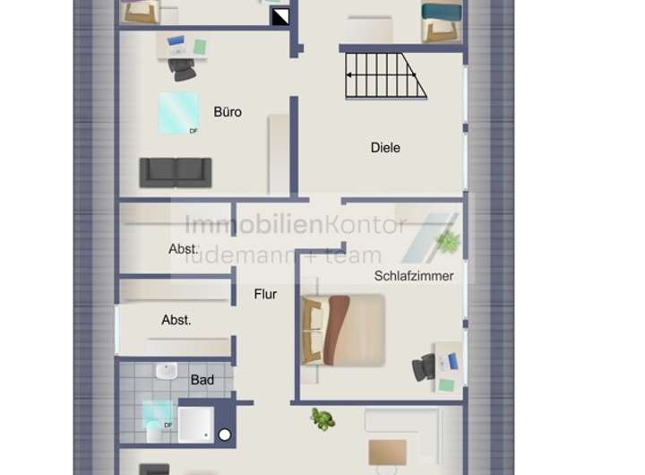 Das Dachgeschoss verfügt über zwei Flure, ein Büro, drei Schlafzimmer – von denen zwei miteinander verbunden sind –, ein Wohnzimmer, ein Duschbad sowie zwei praktische Abstellräume. Im Jahr 2024 wurden sämtliche Fenster (außer den Dachflächenfenstern) erneuert. Außerdem wurden die alten Zimmertüren und Böden entfernt, die Wände frisch tapeziert und weiß gestrichen. Vor dem Einzug wird der Vermieter im Dachgeschoss Laminatboden verlegen und Zimmertüren einbauen.