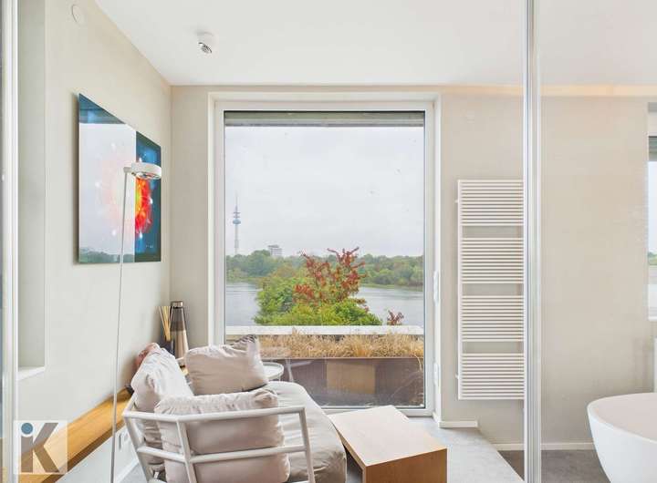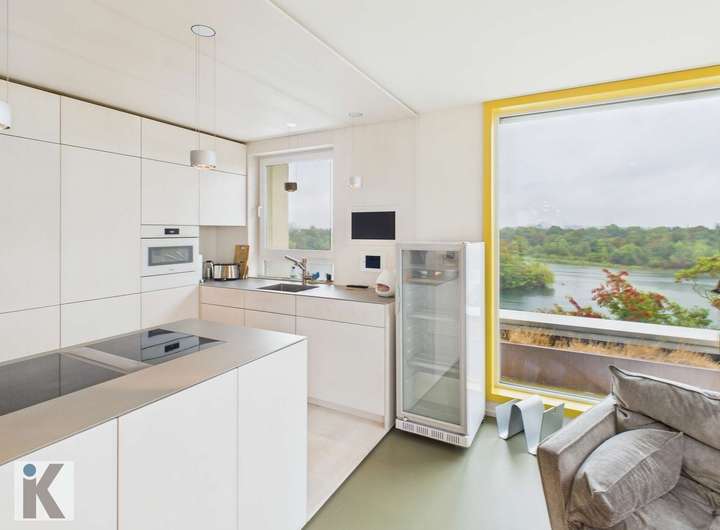 Im Inneren wird sofort die Liebe zum Detail spürbar: Lichtdurchflutete Räume mit großzügigen Panoramafenstern eröffnen beeindruckende Ausblicke auf den See und das umliegende Grün, während hochwertige Echtholzverkleidungen, natürliche Materialien und eine harmonisch abgestimmte Beleuchtung eine Atmosphäre von Ruhe und Geborgenheit schaffen. Die mit natürlichem Ton und energetischem Diamantenpulver veredelten Wände – ein außergewöhnliches Merkmal, das die Luftqualität verbessert und den Räumen besondere Strahlkraft verleiht – gehen dabei nahtlos in die vollständige, mit handgefertigten Designerleuchten ausgestattete Wohnungsbeleuchtung über, die den exklusiven Charakter des Penthouses eindrucksvoll unterstreicht.