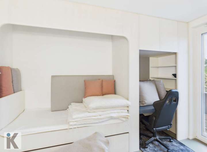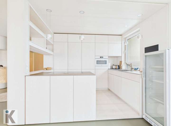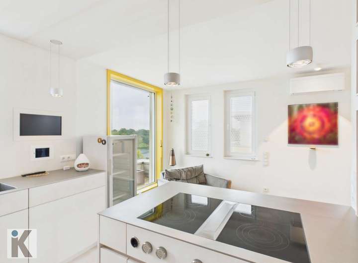 Die maßgefertigte Einbauküche von BORA und Miele überzeugt durch hochwertige Verarbeitung, klare Linien und moderne Funktionalität. Unsichtbar in die Wände integrierte Lautsprecher sorgen für dezenten Klanggenuss, während Insektenschutz an allen Terrassentüren und eine exklusive Lichtgestaltung im gesamten Innen- und Außenbereich für höchsten Komfort sorgen.