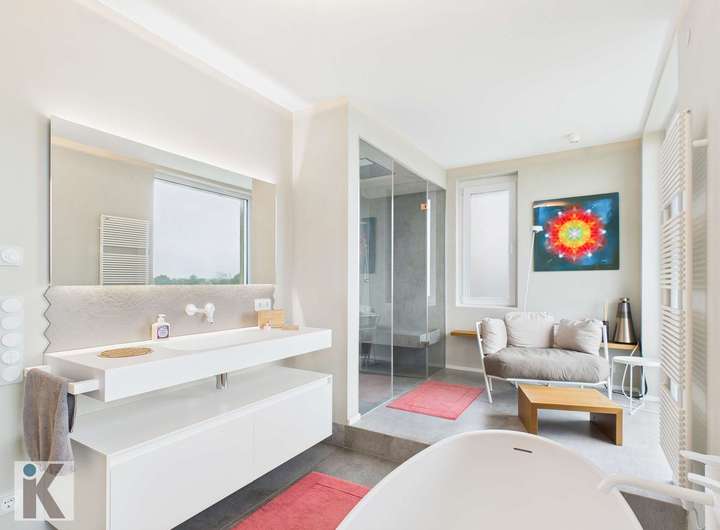 Ein besonderes Highlight ist das luxuriöse Badezimmer – ein Ort der Erholung und Regeneration. Der Unterboden wurde mit echten Bergkristallen ausgestattet, die freistehende Badewanne und das Dampfbad mit Panoramafenster der italienischen Luxusmarke Effe versprechen Wellness auf höchstem Niveau. Eine integrierte Osmoseanlage sorgt zudem für kristallklares Trinkwasser in bester Qualität.