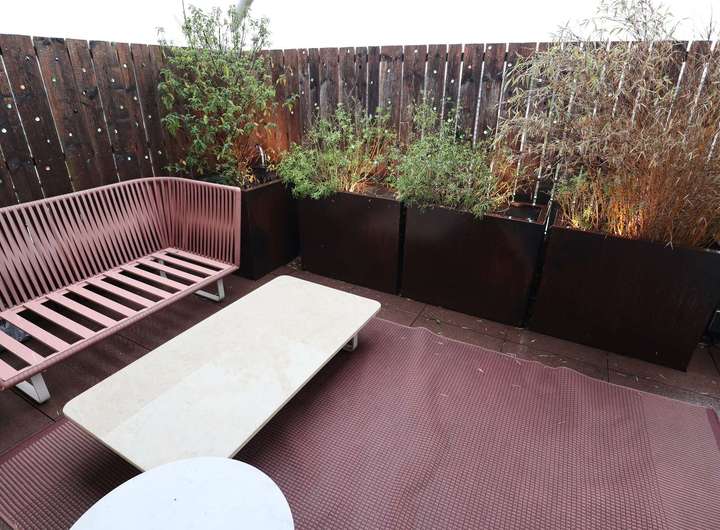 Vollständig begrünte Terrassen mit Cortenstahltöpfen und Bewässerungsanlage