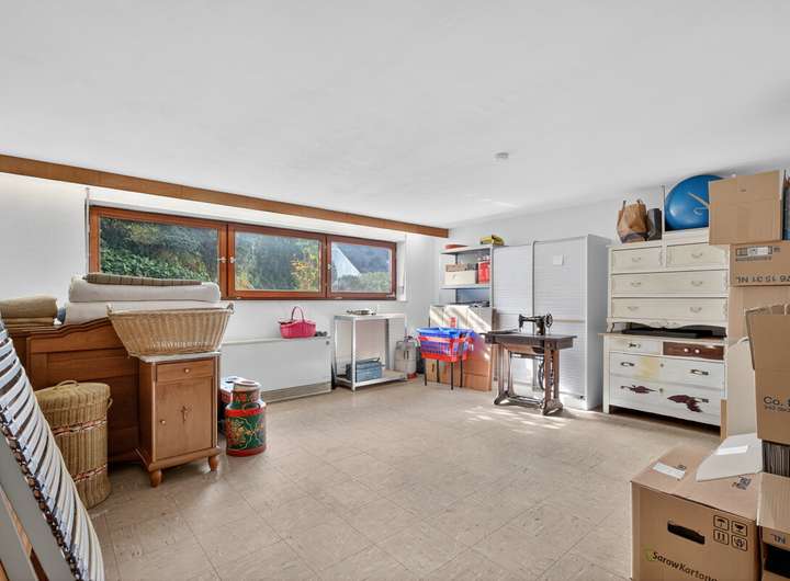 Die Immobilie ist voll unterkellert und bietet hier zahlreiche Nutzungsmöglichkeiten: Ein großer Hobbyraum, eine Sauna mit Dusche sowie ein uriges Kellerstüberl mit Bar sorgen für viel Platz und Komfort. Im Bereich des Hobbyraums zeigen sich partielle Feuchtigkeitsspuren an einer Außenwand – die Ursache ist bislang nicht abschließend geklärt, eine Instandsetzung oder Sanierung kann erforderlich sein.
