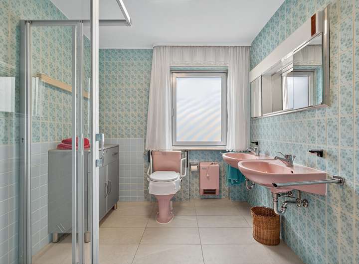 * Tageslicht-Badezimmer EG: deckenhoch gefliest in Blau; bodentiefe Dusche, Boden-WC, zwei Waschbecken, Bidet