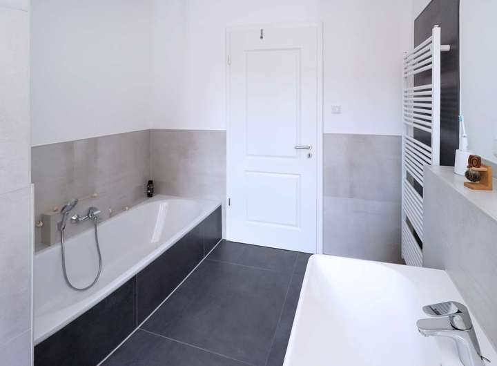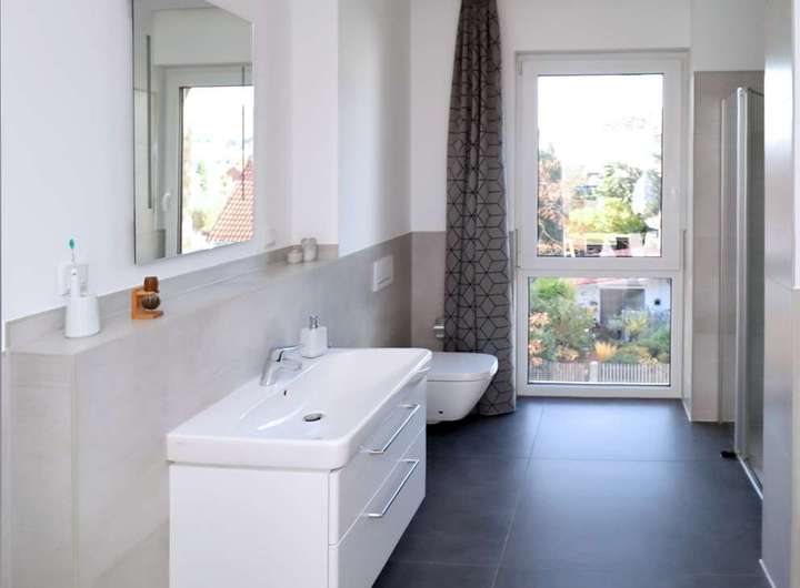 • Tageslichtbadezimmer mit barrierefreier Walk-In-Dusche und Badewanne