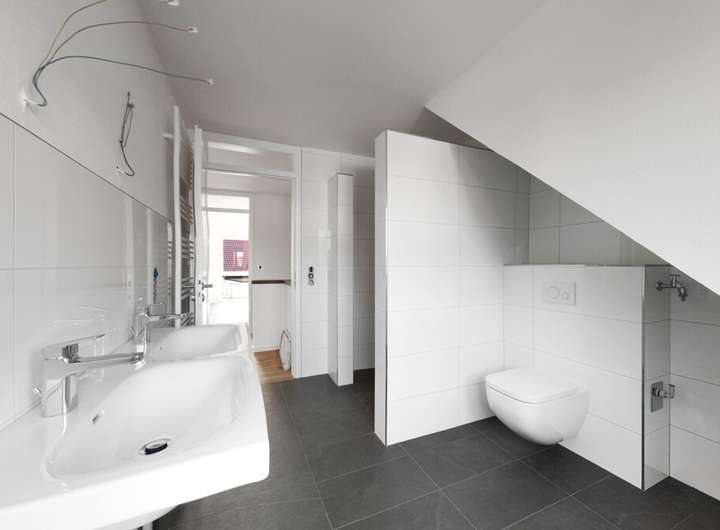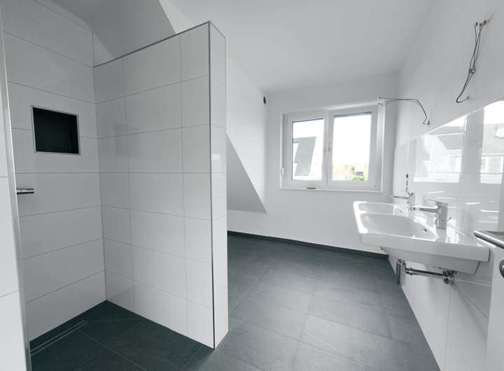 - großes Tageslichtbadezimmer mit zwei Waschbecken, ebenerdiger Dusche, WC, Waschmaschinenanschluss sowie einem Handtuchheizkörper