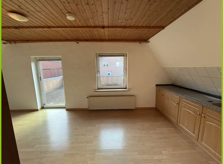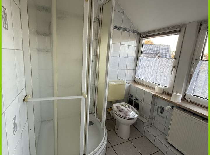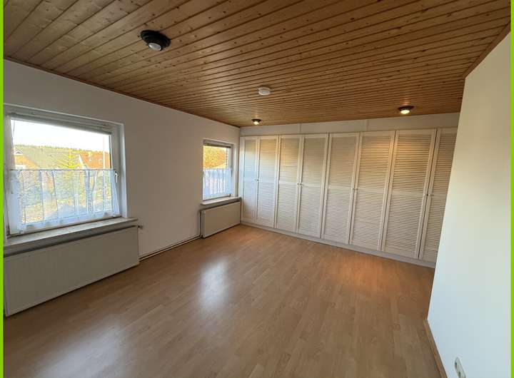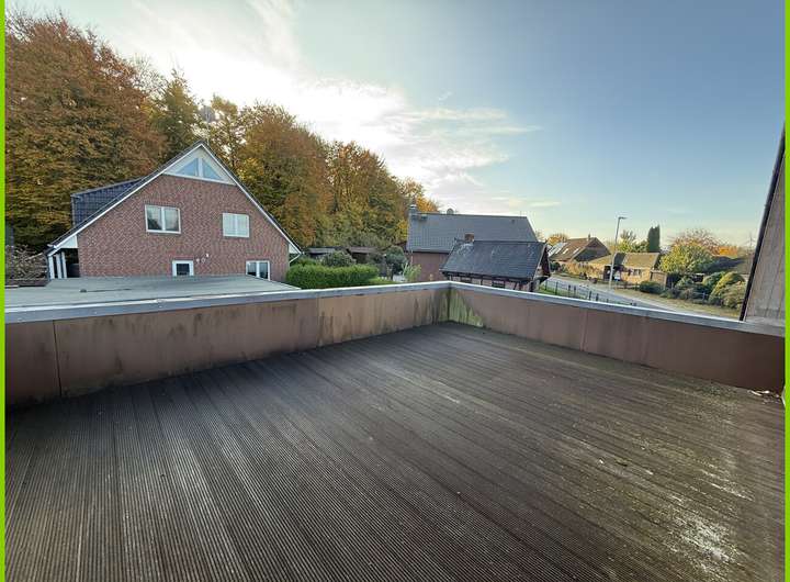 Über eine Holztreppe erreichen Sie das Obergeschoss. Dort erwartet Sie ein Schlafzimmer mit einem großen Einbauschrank sowie ein weiteres Badezimmer mit Dusche (Duschabtrennung wird erneuert). Ein weiterer Wohn- und Essbereich mit einer zusätzlichen kleinen Küchenzeile befindet sich ebenfalls im Obergeschoss. Von hier aus haben Sie auch Zugang zu einem ca 30 qm großen Balkon, der dank Markise flexibel nutzbar ist und für gemütliche Stunden einlädt. Die Obergeschosswohnung ist mit Laminatboden versehen. Zusätzlich gibt es eine ausziehbare Treppe ins Dachgeschoss, das weiterem Stauraum bietet.