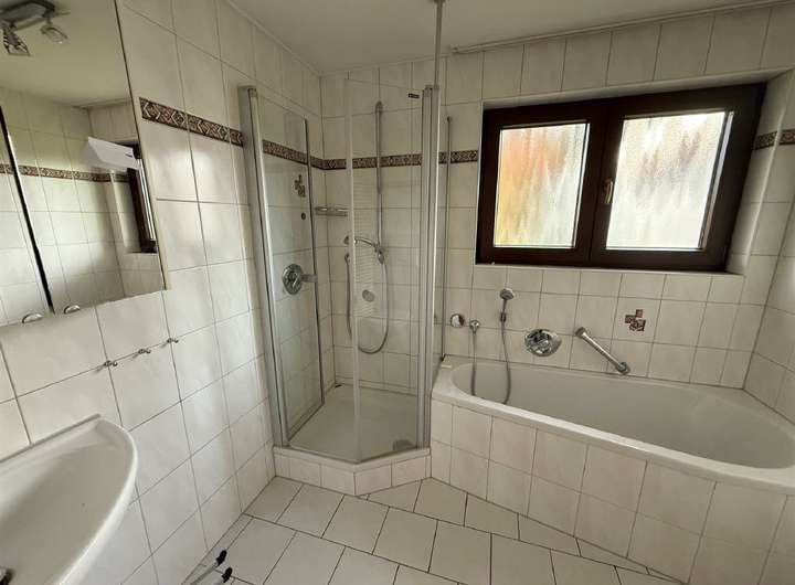 Ein Schlafzimmer steht auch noch zur Verfügng und ein Bad, welches mit einer Badewanne, Glasdusche, einem Einzelwaschbecken, WC und Handtuchhalter ausgestattet ist und im Jahr 1995 renoviert wurde. Das separate Gäste-WC rundet diese Ebene ab.