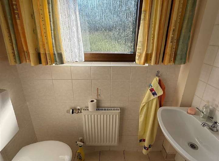 Ein Schlafzimmer steht auch noch zur Verfügung und ein Bad, welches mit einer Badewanne, Glasdusche, Einzelwaschbecken, WC und Handtuchhalter ausgestattet ist und im Jahr 1995 renoviert wurde. Das separate Gäste-WC rundet diese Ebene ab.