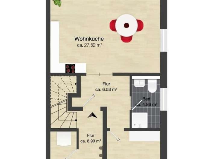 Die Küche bildet das Herzstück des Erdgeschosses und bietet ausreichend Platz für gemeinsame Kochabende und gesellige Runden. Ein modernes Badezimmer mit Dusche ergänzt das Raumangebot und verbindet Funktionalität mit Komfort.