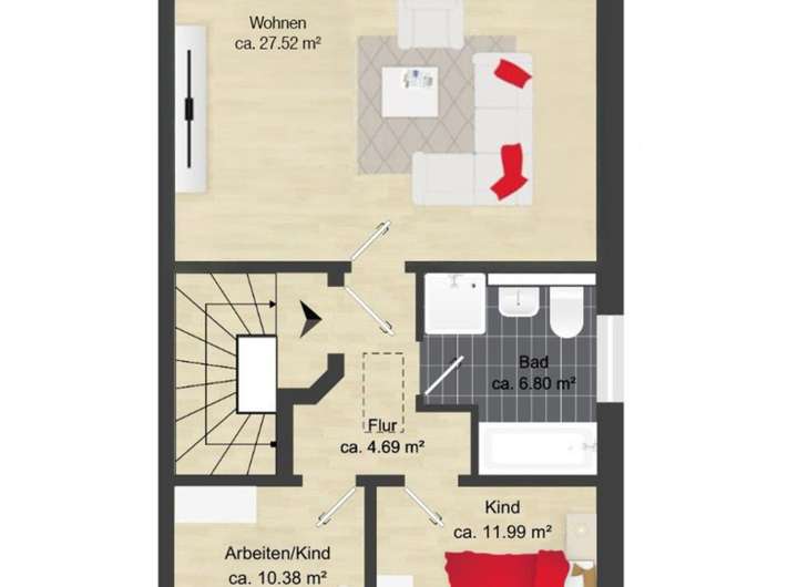 Das Obergeschoss besticht durch eine großzügige Raumaufteilung. Das offene Wohnzimmer schafft eine helle, freundliche Atmosphäre zum Entspannen. Von hier aus haben Sie direkten Zugang zum Balkon, der einen idyllischen Rückzugsort im Freien bietet.