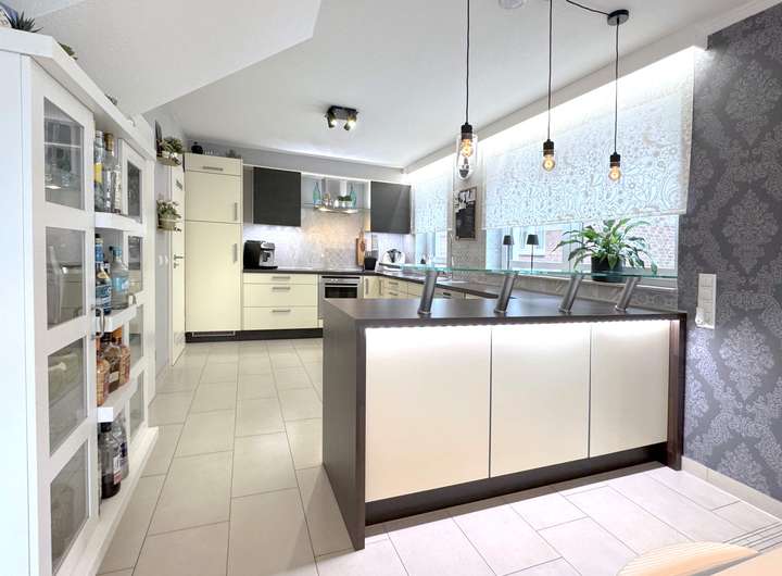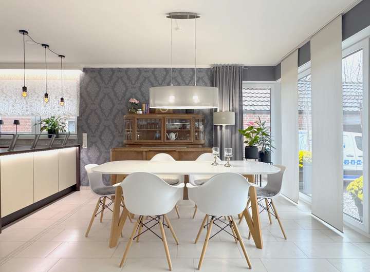 EG: Einladende Diele, großes, lichtdurchflutetes Wohn-Esszimmer mit offener Küche und Blick auf die Terrasse und in den tollen Garten. Repräsentatives Gäste-WC, großer Hauswirtschaftsraum, Abstellraum an der Küche.