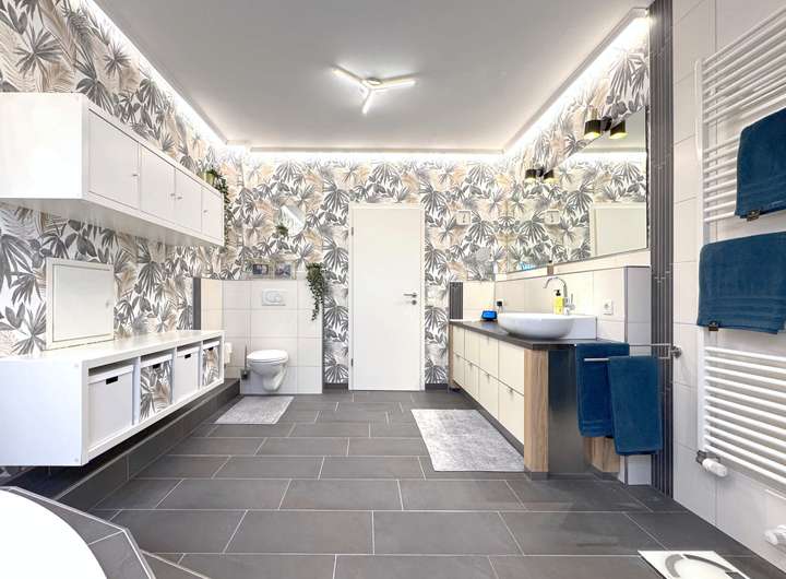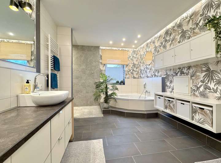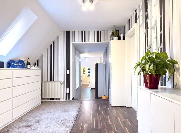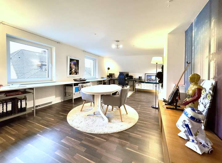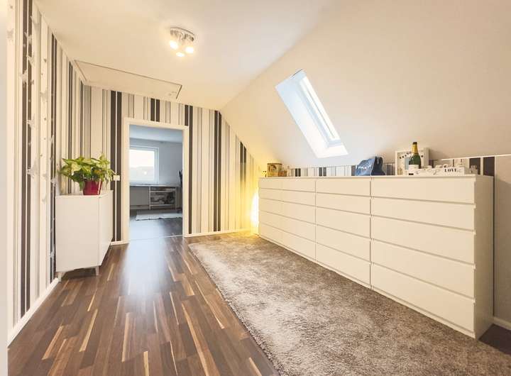 DG: Großzügiger, schicker Flur, großes behagliches Schlafzimmer mit Ankleidebereich, ein Wellnessbad, das keine Wünsche offen lässt, Arbeitszimmer (optional aufteilbar in zwei Räume), Gästezimmer, Hobbyraum. Fazit: genügend top gepflegter Raum für die Familie.