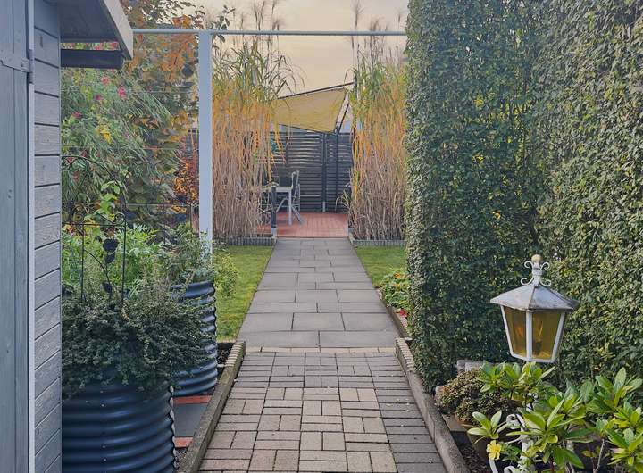 Garten: liebevoll gestaltet mit Beeten, Pflasterflächen, Gemüsegärtchen mit Schuppen, Terrasse mit Glasdach und Markise und Freisitzen.