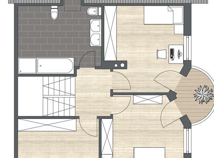- im DG befinden sich ein Schlafzimmer und zwei weitere Zimmer mit Zugang zum Balkon