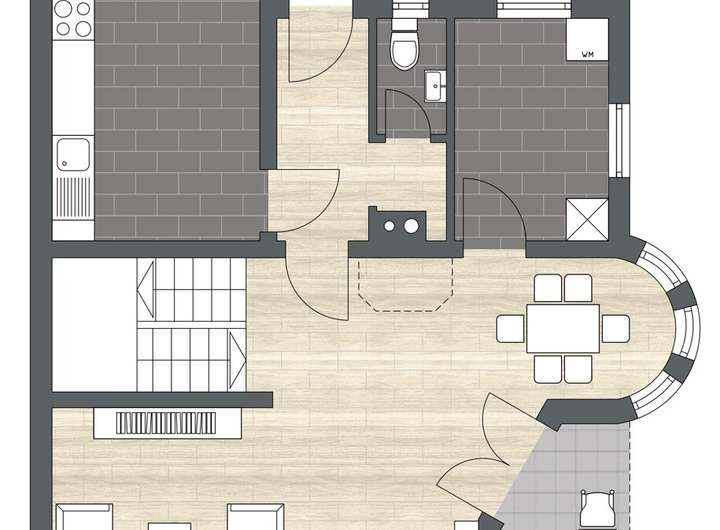 - sehr großer Küche mit allen Elektrogeräten und eigenem Essbereich