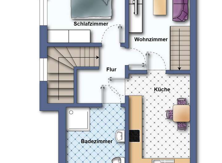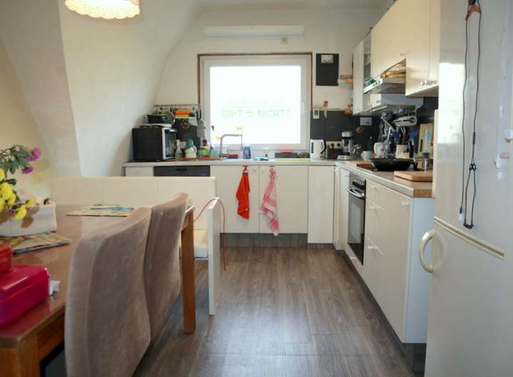 1 Flur, 1 Tageslicht-Badezimmer mit Dusche und Waschmaschinenanschluss, 1 Schlafzimmer, 1 Küche inkl. Einbauküche, 1 Wohnzimmer mit Treppenaufgang zum teilweise ausgebauten Spitzboden.