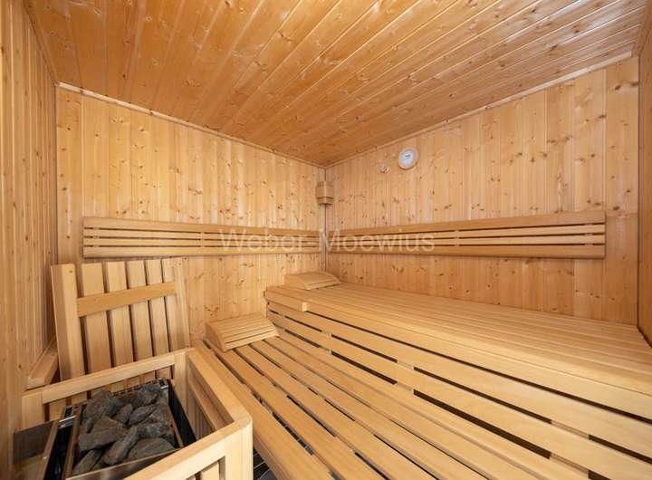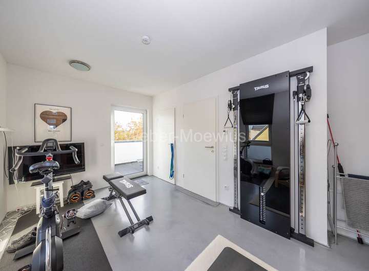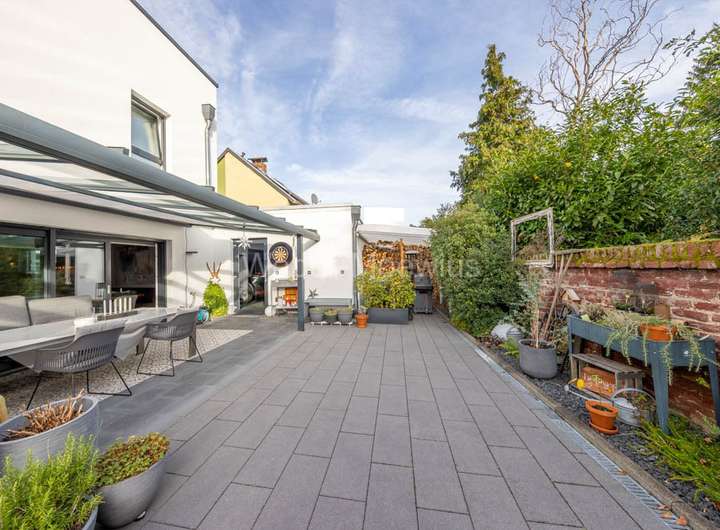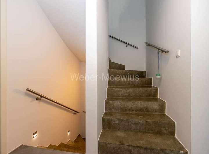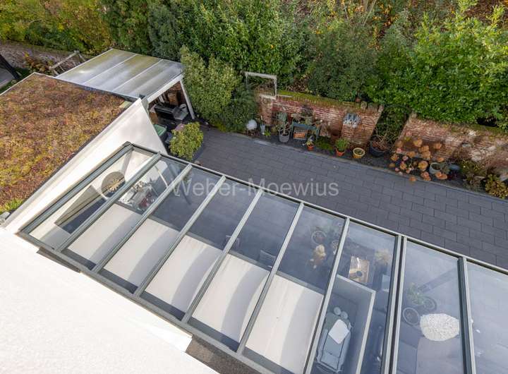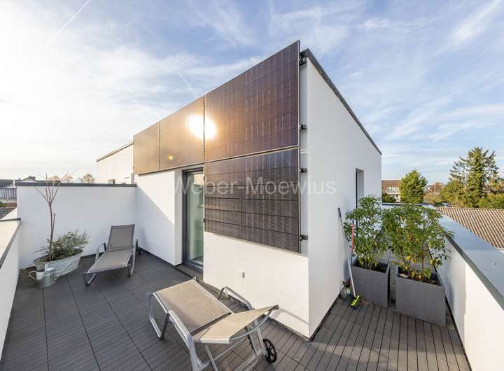 Zusätzlich zur rückwärtigen, geschützten Terrasse mit breiter Glasüberdachung bietet bei entsprechender Witterung auch die an das Staffelgeschoss anschließende Dachterrasse einen attraktiven Aufenthaltsbereich an der frischen Luft.