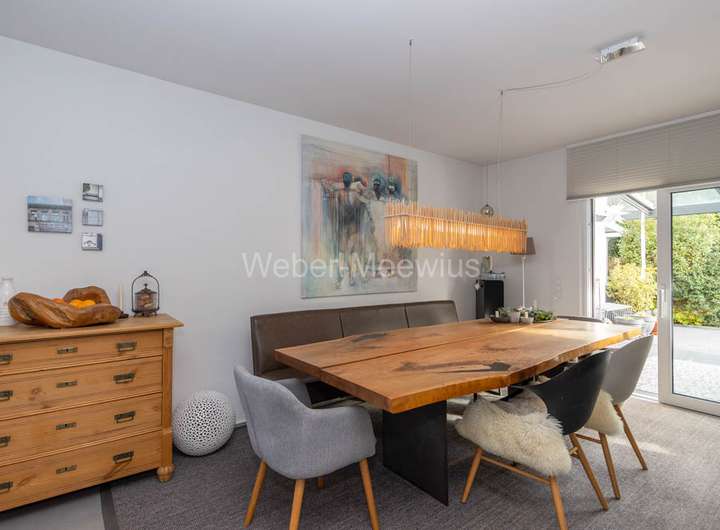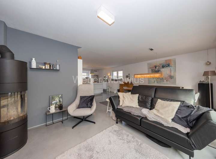 Als Herzstück und familiärer Mittelpunkt des Hauses präsentiert sich der Wohn- und Essbereich mit offener Küche. Ein hoher, schlanker Kaminofen sorgt in der kälteren Jahreszeit für das i-Tüpfelchen an Behaglichkeit.