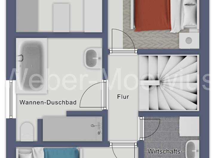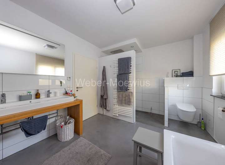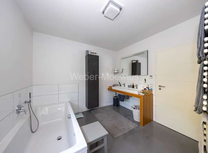 - Tageslicht-Bad im OG mit Wanne, bodengleicher Dusche, Doppelwaschtisch, WC, HHK