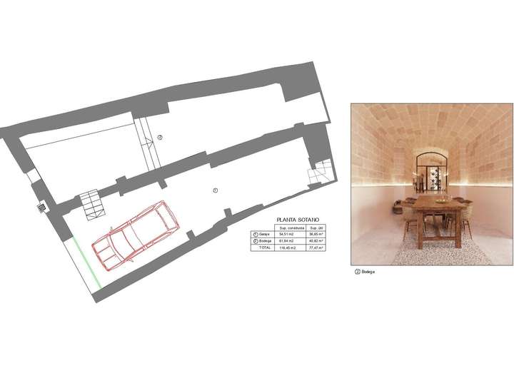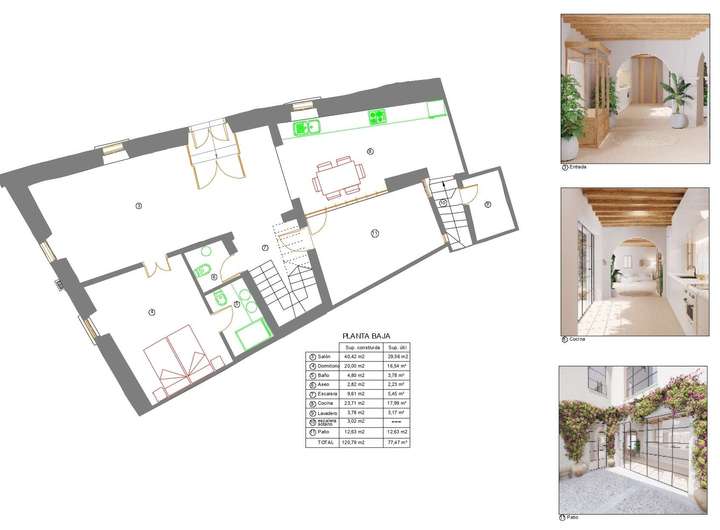 Im Erdgeschoss öffnet sich ein weitläufiger Wohn-, Ess- und Küchenbereich, der durch große Fensterflächen viel Licht einlässt und den Blick auf den hellen, privaten Innenhof freigibt – ein geschützter Ort der Ruhe mitten im lebendigen Zentrum von Artà. Auf dieser Ebene befindet sich außerdem ein Schlafzimmer mit Bad en suite sowie ein separates Gäste-WC, ideal für Komfort und Flexibilität im Alltag.