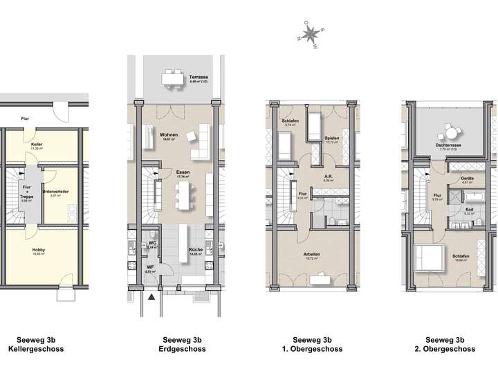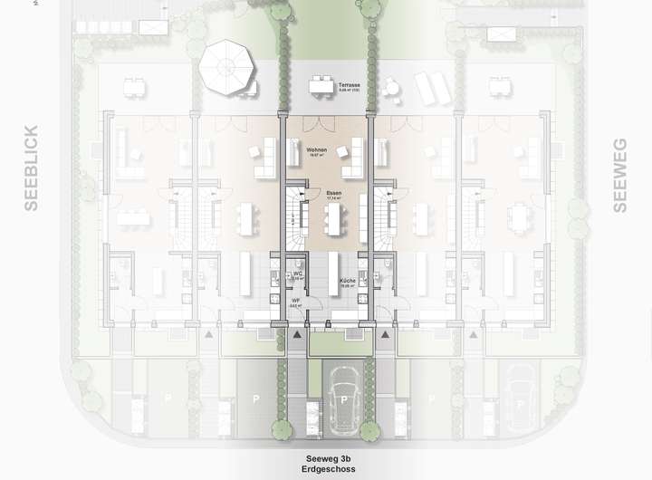 Dieses in der Mitte unserer als Reihenhäuser angelegten 5 Town-Häuser am Seeweg verfügt über eigene Grün- und Gartenflächen von ca. 37 qm mit einer Terrasse zum begrünten Innenhof. Im 2. OG befindet sich die große, loggiaähnliche Dachterrasse. Nach Westen haben Sie einen unverbaubaren Blick auf den Heidenturm.