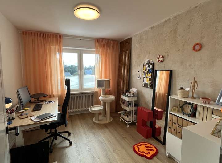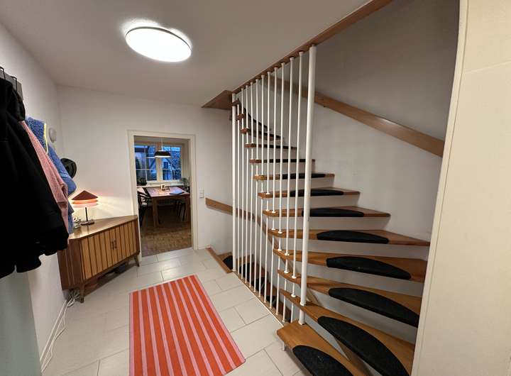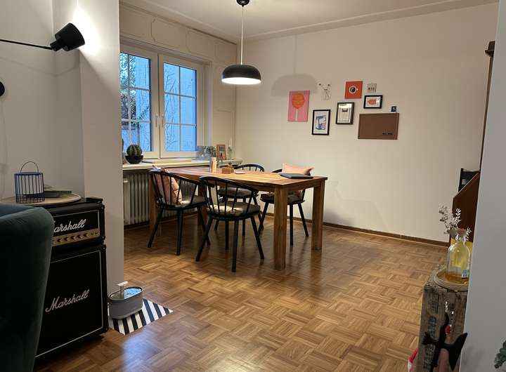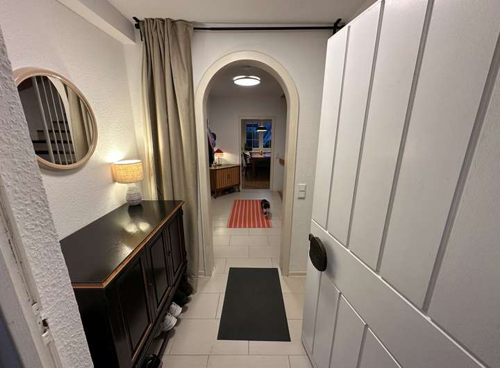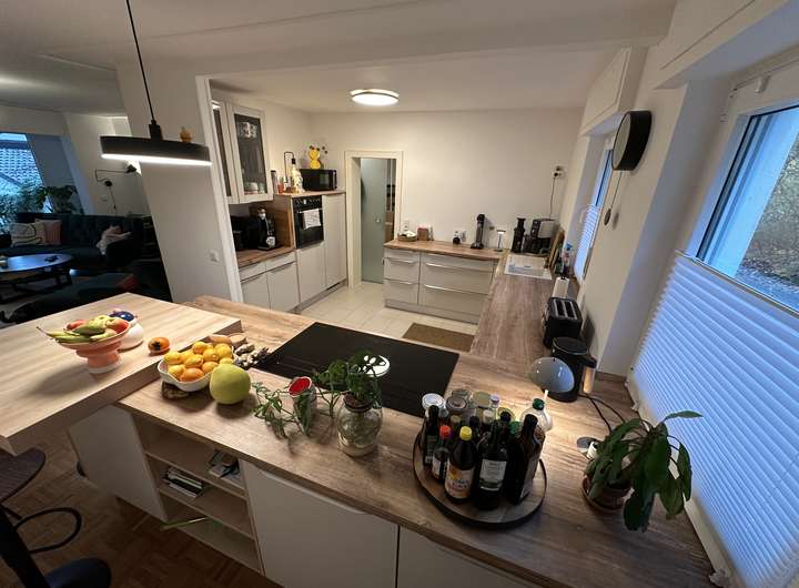 Im Erdgeschoss befindet sich die große Küche, die in den gemütlichen Wohn-/Essbereich übergeht. Die Einbauküche ist bereits im Mietpreis enthalten. Aus dem Wohnbereich belangt man auf die 2025 erneuerte, überdachte Terrasse. Der Garten beherbergt einen Quitten- und einen Apfelbaum und freut sich darauf, von euch nach euren Wünschen gestaltet und genutzt zu werden. Das Gäste WC wurde erst vor kurzem erneuert.