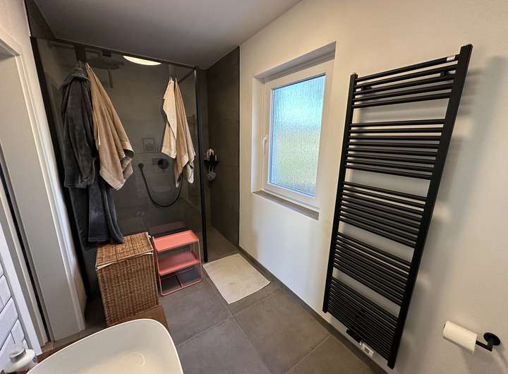 Im Obergeschoss liegt das in 2022 renovierte Hauptbad mit großer ebenerdiger Dusche, Handtuchheizung, Massivholz Waschtischunterschrank und beheizbarem Spiegel. Die drei Zimmer im 1. OG können als Schlaf-, Kinder- oder Arbeitszimmer genutzt werden. Über das größte Zimmer kommt man außerdem auf den Südbalkon.