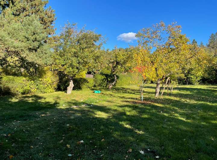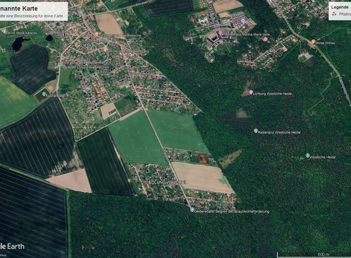 Die Lage zwischen der Straße von Lieskau zum Waldheil und dem Waldrand in West/Ostrichtung, sowie in Nord/Südausrichtung zwischen den Feldern ergibt eine Oase voller Sonne und Ruhe.