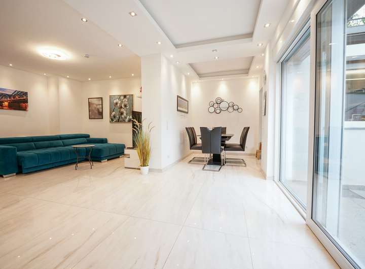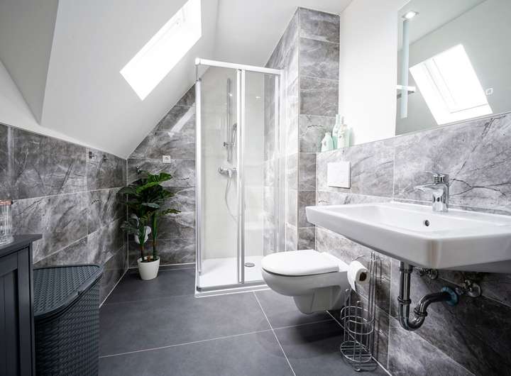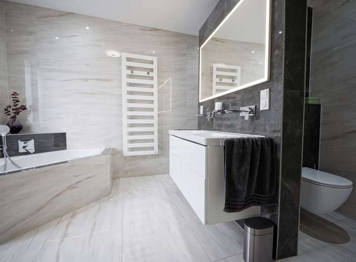 - Moderne Bäder mit großformatigen Fliesen und Tageslicht