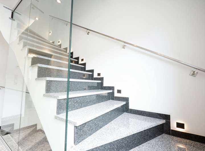 Über die Treppe aus weißem Quarzstein erreichen Sie das erste Obergeschoss. Hier befindet sich das helle Schlafzimmer mit Zugang zum angrenzenden Wintergarten, der Terrasse und dem Garten.