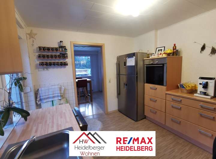 Die gut ausgestatteten Küche, mit holzfarbener Front und decken-hohe Hängeschränke bietet viel Stauraum. Pluspunkt ist eine Terrassentür, welche die Küche mit dem Garten verbindet.