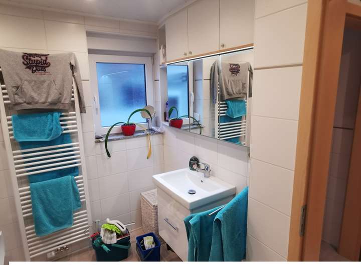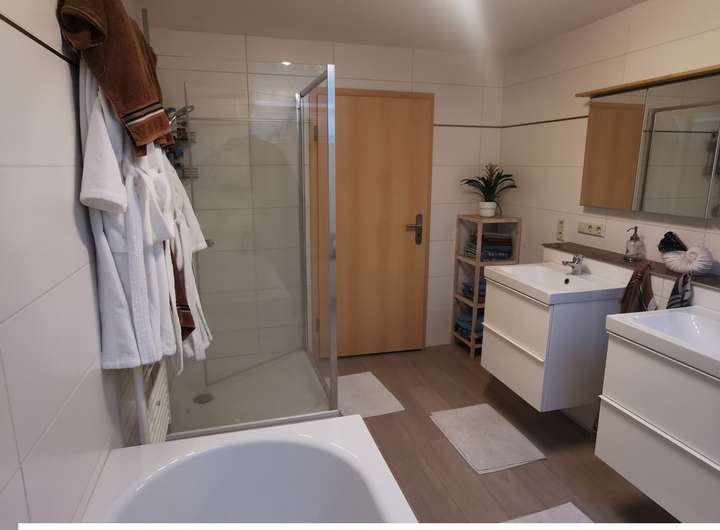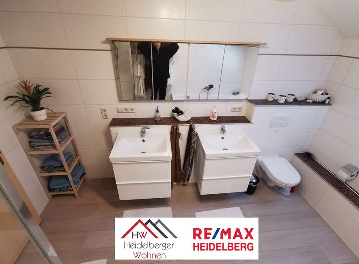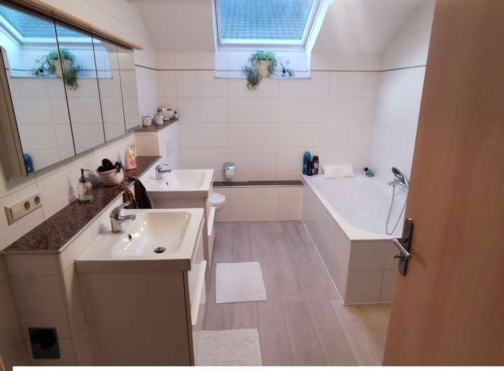 Das Highlight im Obergeschoss ist das gut ausgestattete Bad mit lichtdurchfluteten Dachfenster, übergroßen Badewanne, großen Dusche, zwei separaten Waschbecken und einem WC.