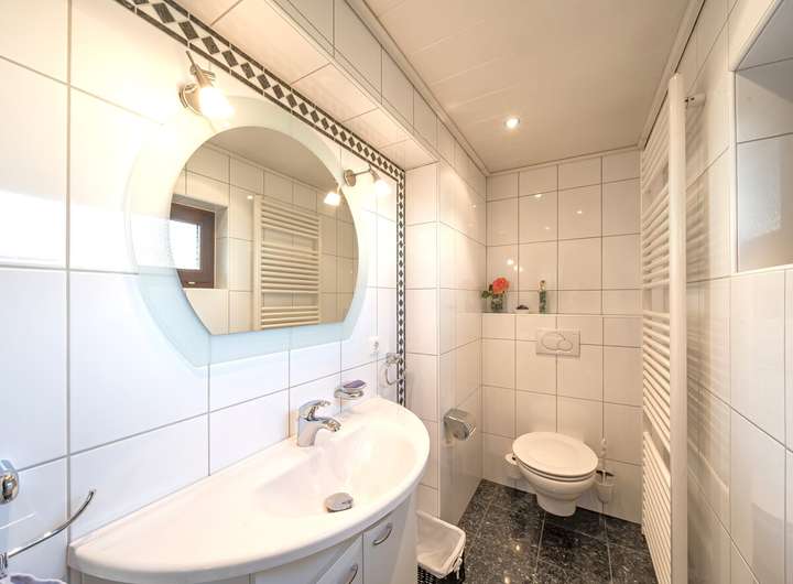 Sanitär: Modernisiertes Badezimmer mit Badewanne, Dusche, WC und Waschbecken, Gäste-WC im EG, zudem im DG WC mit Waschbecken