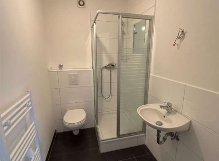 - komplett neues Badezimmer/Dusche mit großformatigen Wand-u. Bodenfliesen, neuen Sanitärobjekten und Handtuchheizkörper