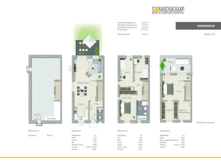 Im Ober- und Dachgeschoss erwarten Sie insgesamt fünf vielseitig nutzbare Zimmer – perfekt als Schlafzimmer, Kinderzimmer, Homeoffice oder Gästezimmer. Von der Dachterrasse genießen Sie den herrlichen Blick in den Garten und die grüne Umgebung.