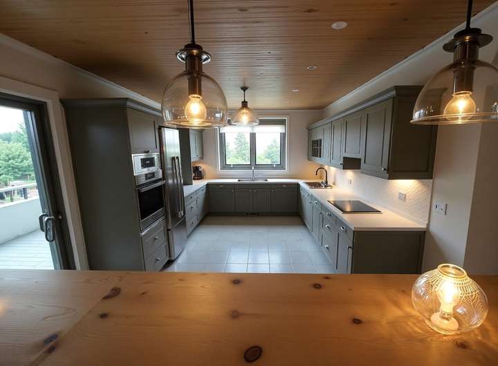 Große Fensterflächen lassen viel Licht in den Wohnbereich. Ein Kamin lädt zum Verweilen ein. Der Essbereich bietet Platz für große Runde. Die offene Küche ist durch einen Tresen vom Essbereich getrennt und verfügt über einen separaten Abstellraum.