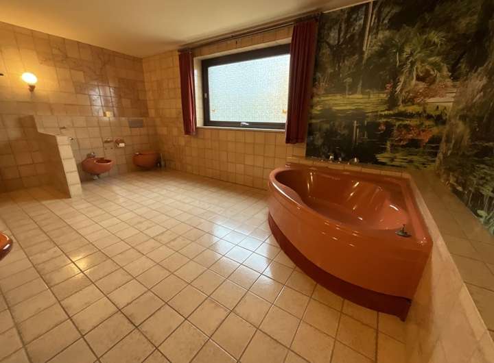 Der Elternschlafbereich befindet sich ebenfalls im Erdgeschoss. Er verfügt über umfangreiche Einbaumöbel die im Haus verbleiben, einen Zugang zur Terrasse sowie ein sehr großes Tageslichtbadezimmer mit Eckbadewanne, Dusche, WC und Bidet. Die Badelemente und Armaturen stammen aus dem Baujahr. Hier lässt sich eine moderne und gemütliche Wellnessoase gestalten und Platz für die Sauna gibt es auch.
