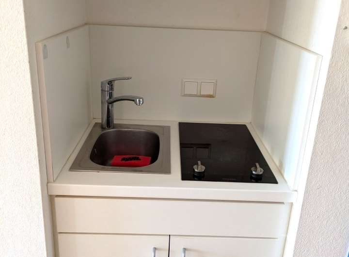 Eine Kochnische mit Spülbecken und Herd ist ebenfalls vorhanden.