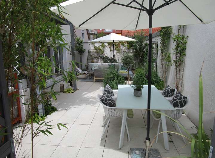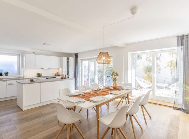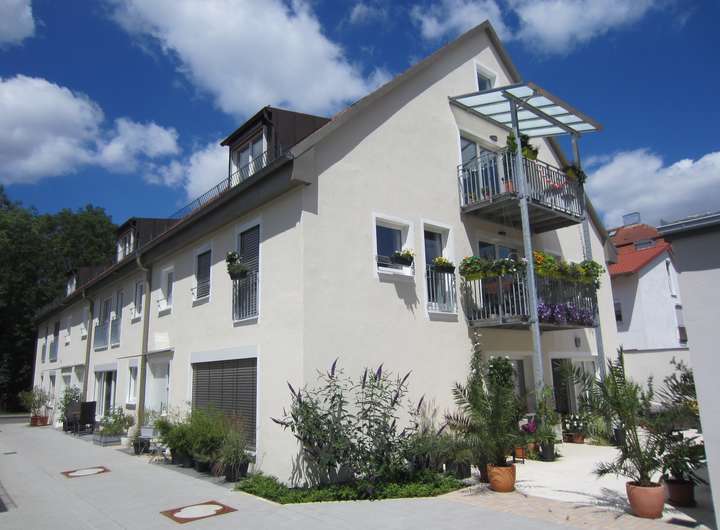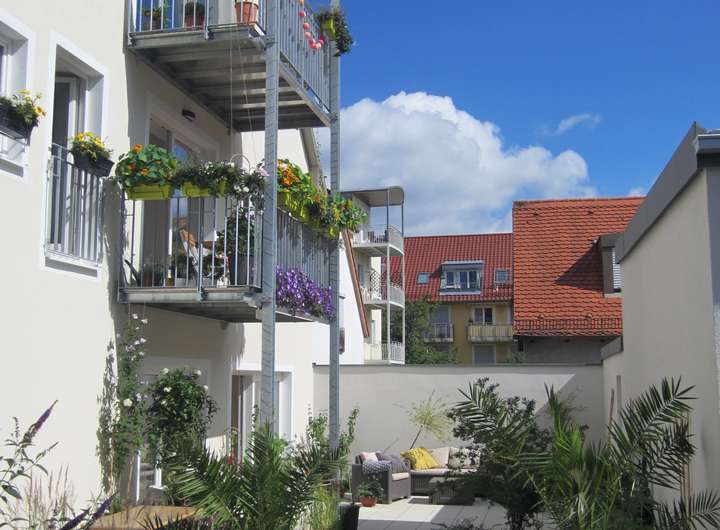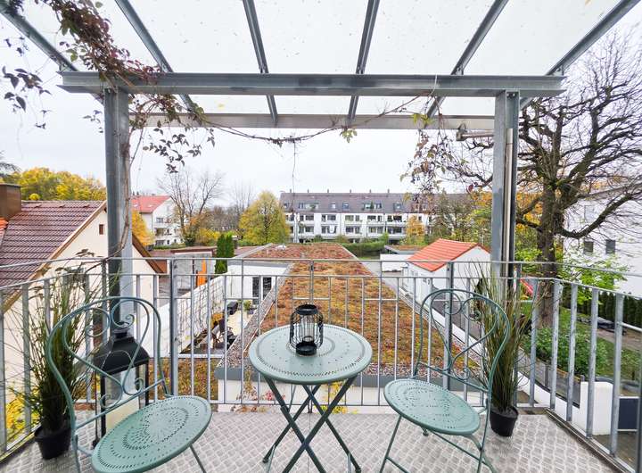 Das hier vorgestellte Reihenendhaus liegt weg von der Planeggerstraße und bildet die rückwärtige Einheit des Vordergebäudes mit großer Terrasse und zwei Balkonen.