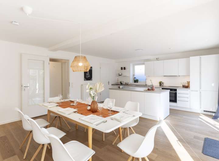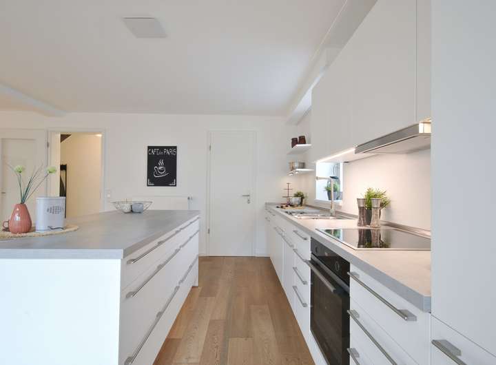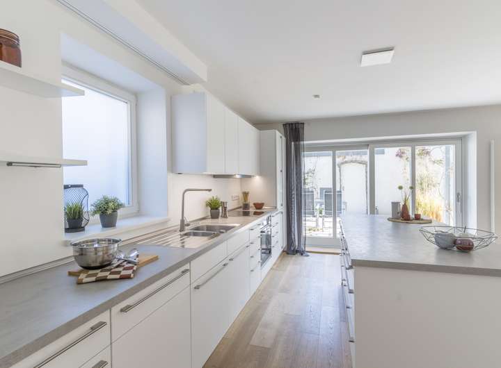 Eine hochwertige Einbauküche mit Siemens-Geräten ist eingebaut.