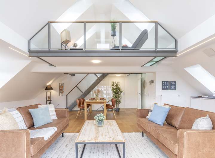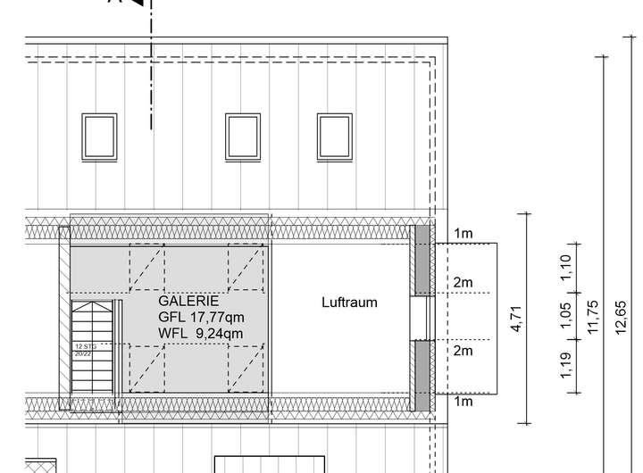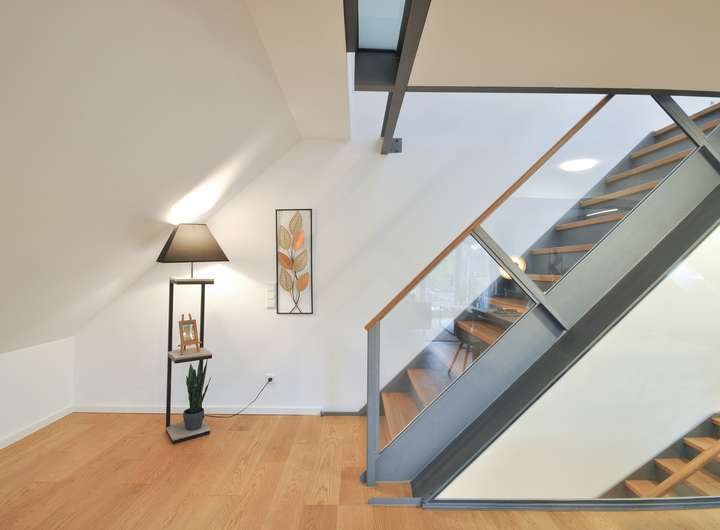 Im lichtdurchfluteten Dachgeschoss mit einer Raumhöhe von 4,90m unter dem First schwebt eine Galerie über der Hälfte des Dachraums.